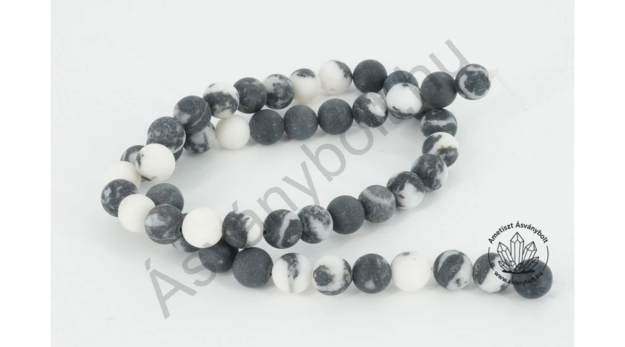Mindig voltak olyan természetes anyagok, amiket a szépségük vagy színeik esetleg könnyi feldolgozhatóságuk miatt ékszerek készítésére használtak. Ilyen a tévesen jáspisnak mondott szürke és fekete mintás mészkő vagy márvány. A fekete színt mangán ásványok beépülése adja. Anyaga megegyezik az Aragonittal vagy a Kalcit ásványokkal, vegyileg kalcium-karbonát, szerkezete sűrűbb, tömörebb. A golyók felületét megmattították, hogy divatos legyen. Sajnos nem időtálló, nem saválló ( verejték megmarja), sósavba dobva erős pezsgéssel feloldódik. Csak egy kicsit szép és nagyon olcsó. A golyókat kb. 8,5 – 9 mm méretűre csiszolták, damilra fűzték kb. 37,5 cm hosszban.